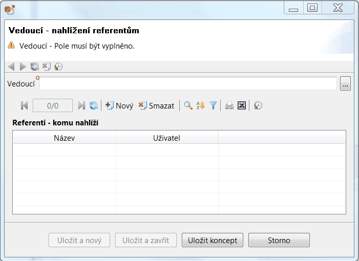 K vedoucímu pracovníkovi je třeba přiřadit referenty, k jejichž dokumentům bude mít přístup - použije se tlačítko Nový nad tabulkou referentů.