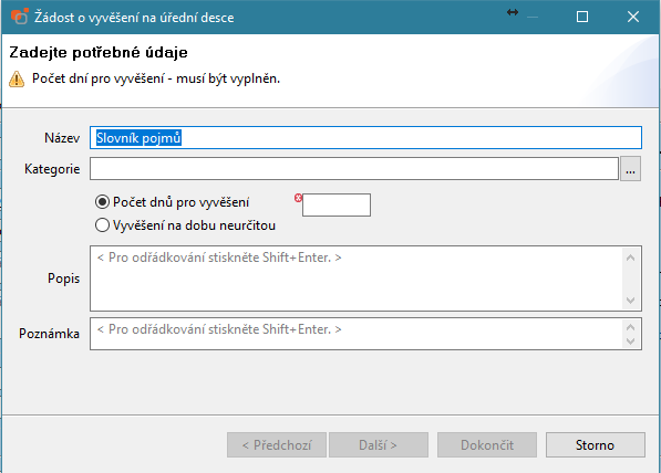 Povinně se musí vyplnit Počet dnů pro vyvěšení nebo je možné zvolit vyvěšení na dobu neurčitou.